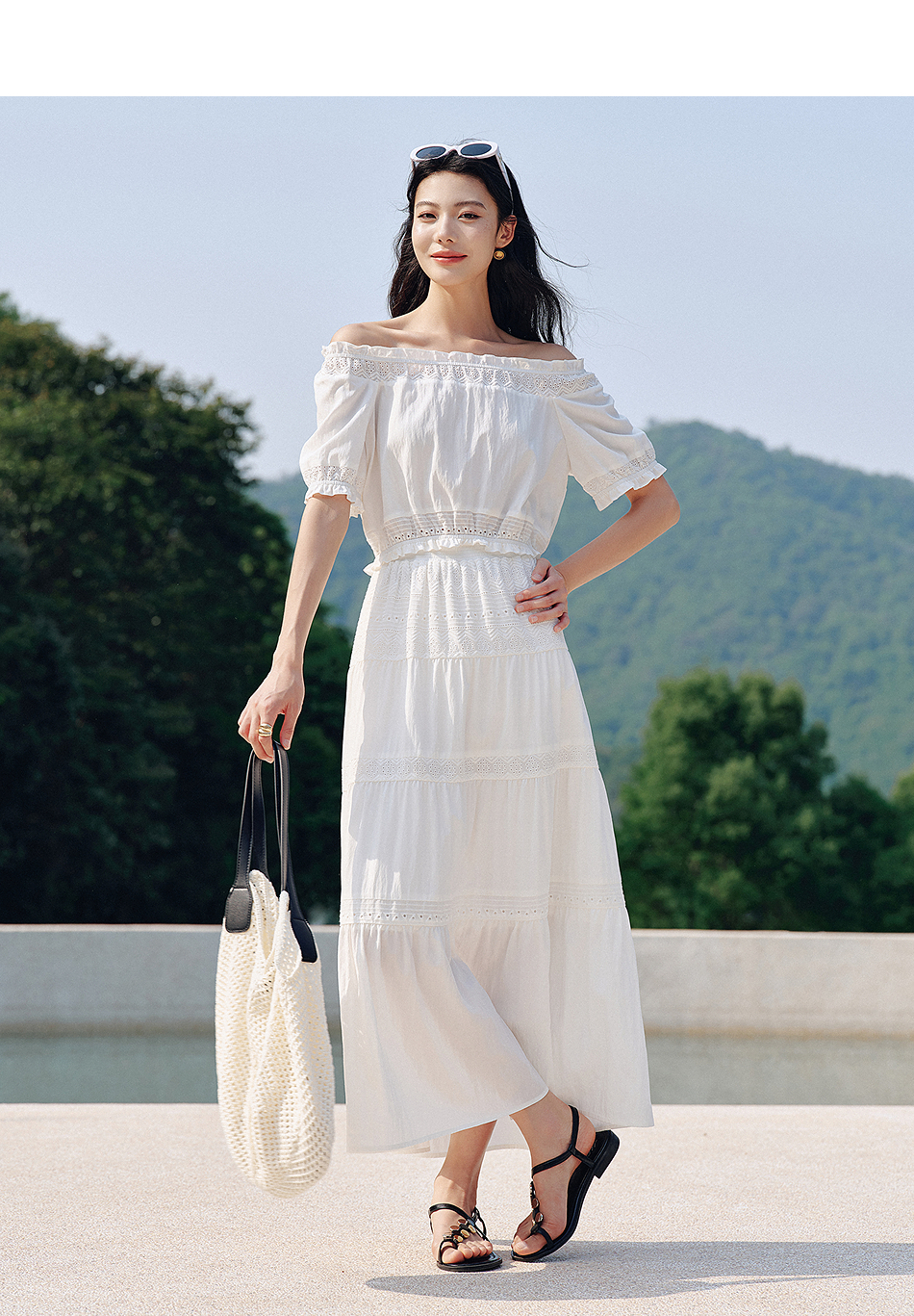 胸元のラインも美しく、夏の日差しに映える白の色味が肌を一層明るく見せてくれます。