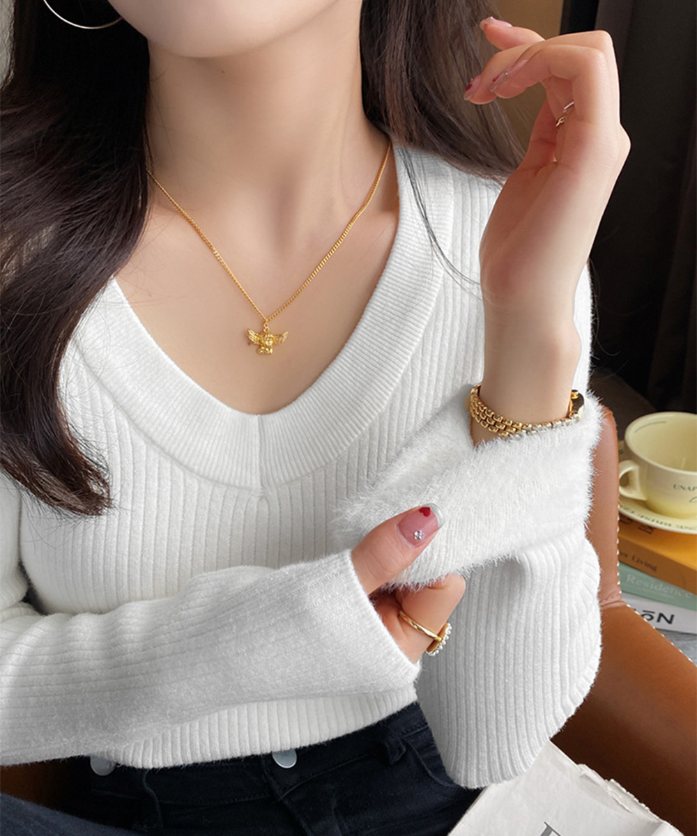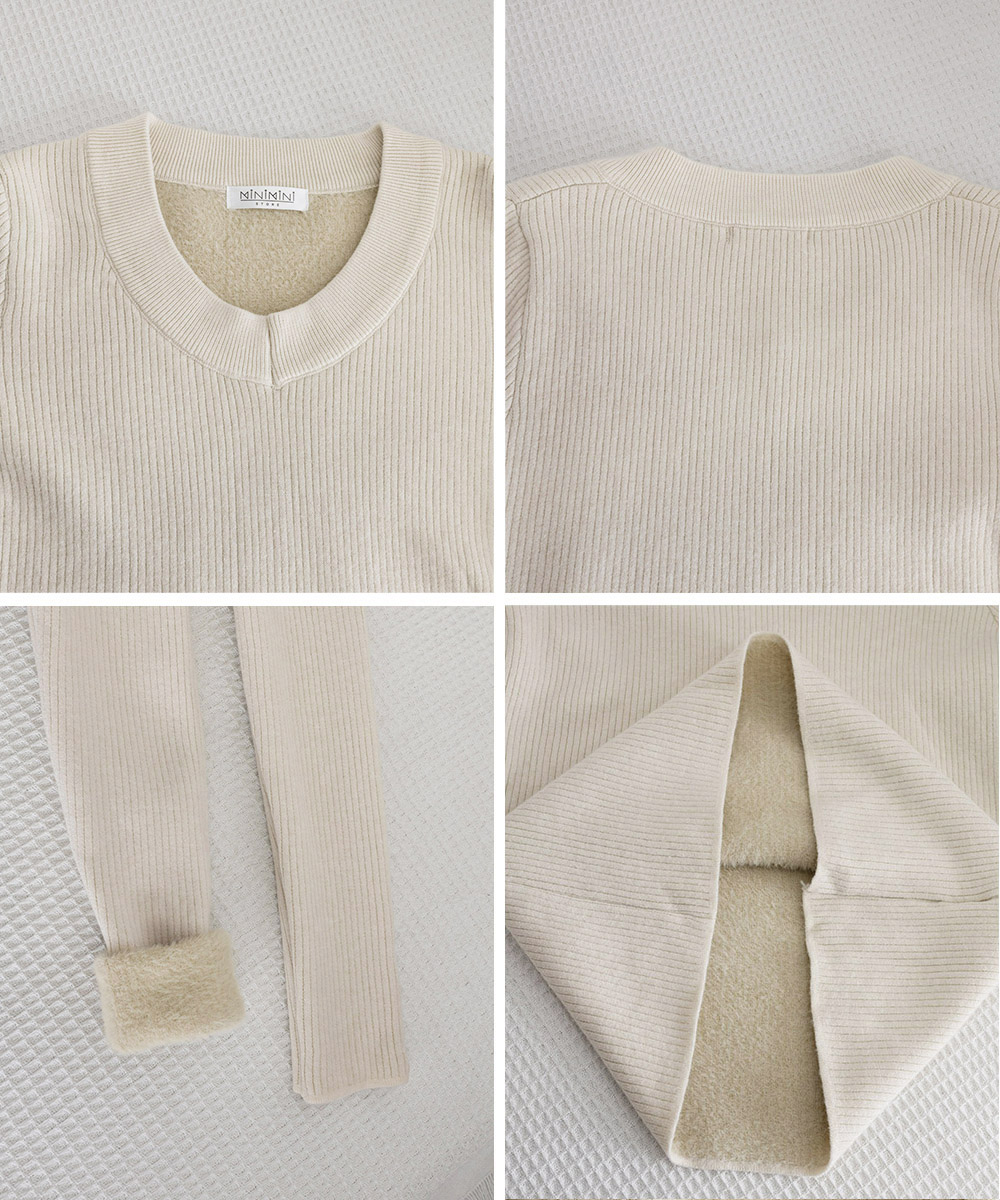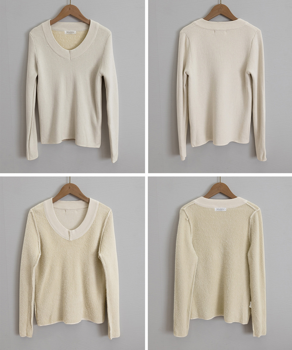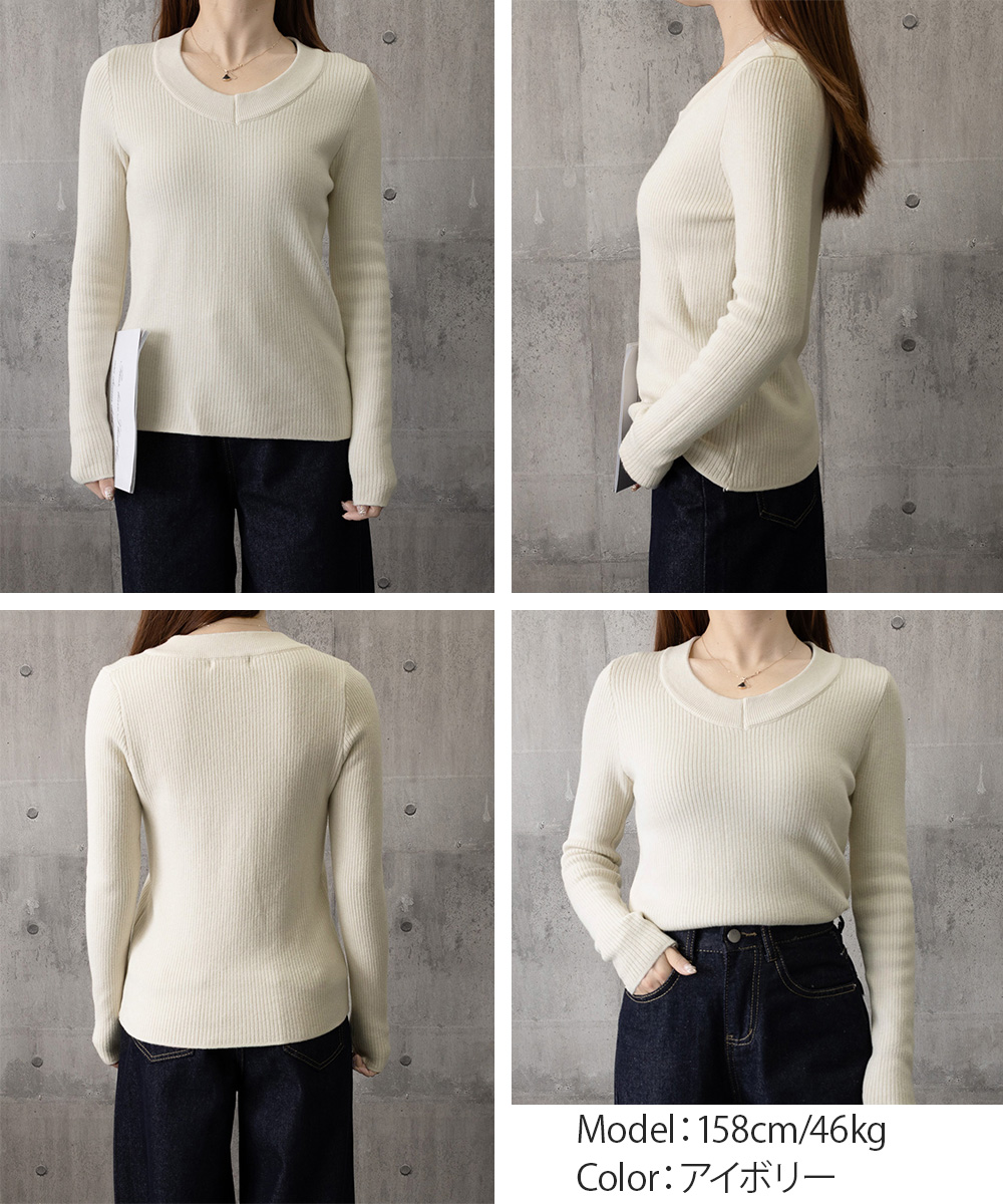 柔らかなリブ編みが魅力の、襟ぐり深めの長袖裏起毛トップス。