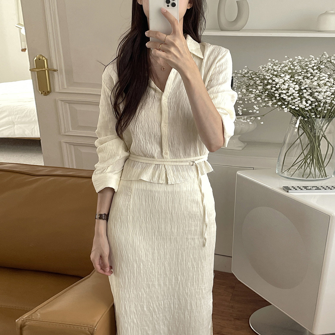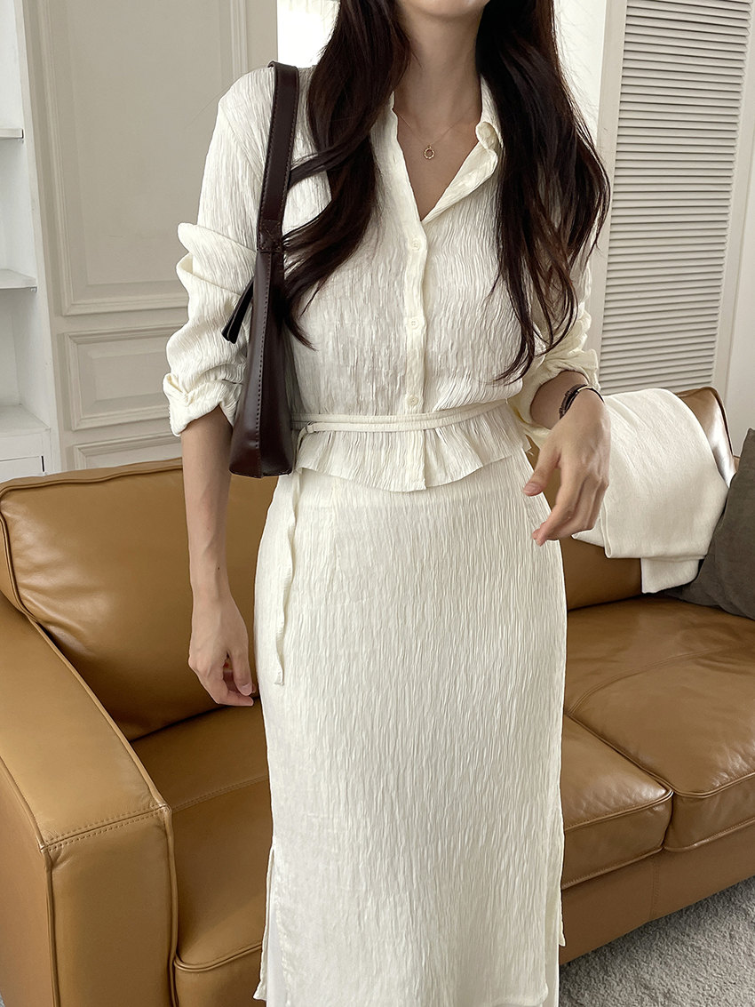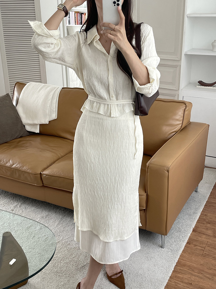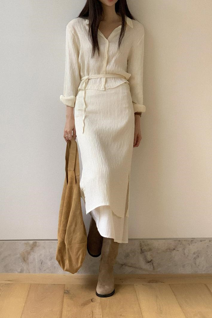 今季注目の韓国風デザインが魅力的なシャツワンピース。 白コーデにぴったりの上品なクリーム色で、ウエストベルトでメリハリのあるシルエットを演出。 シワ加工の素材感がこなれた印象を与え、一枚でおしゃれに決まります。 オフィスからカジュアルまで幅広いシーンで活躍する大人女性のマストアイテム。