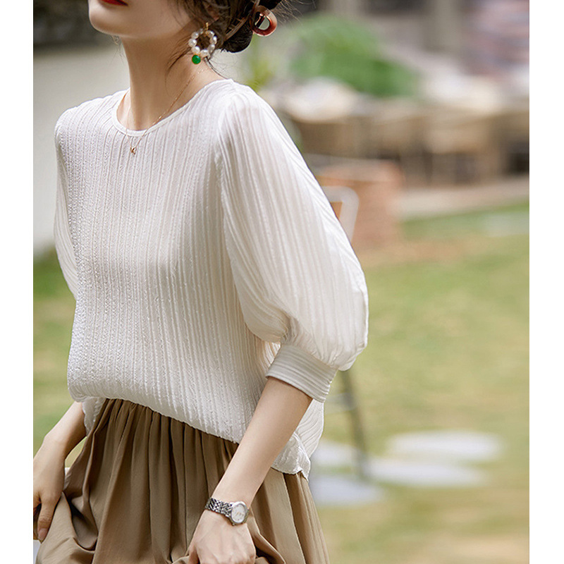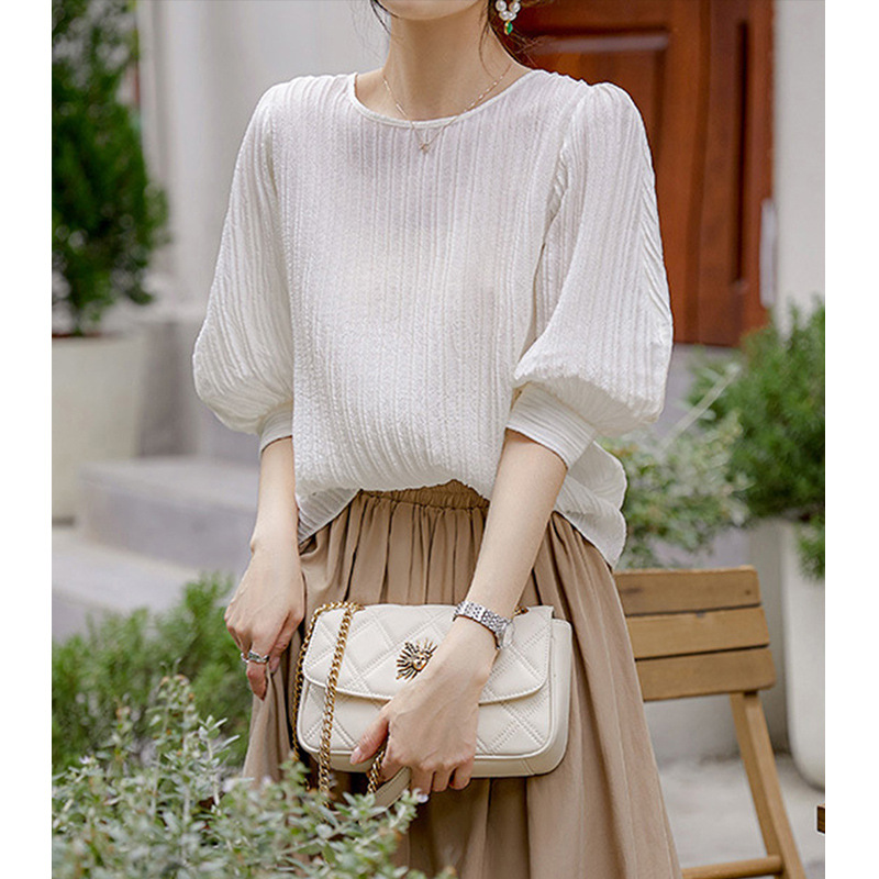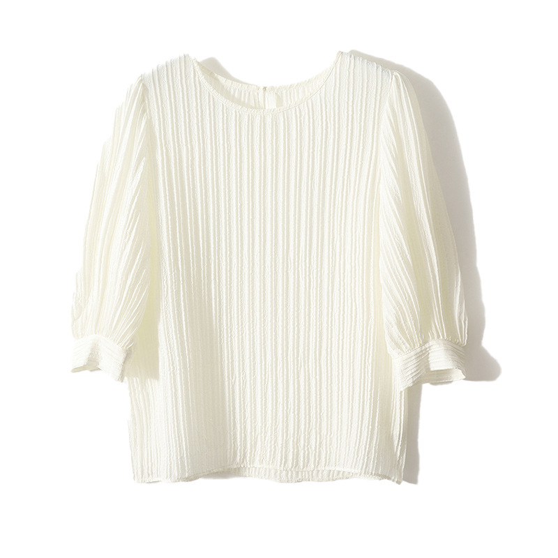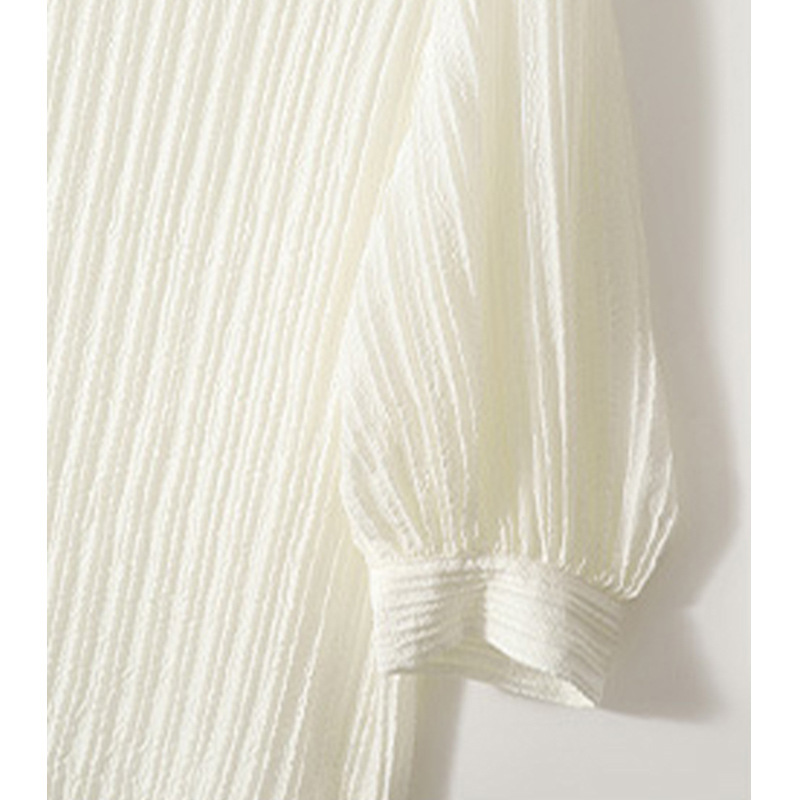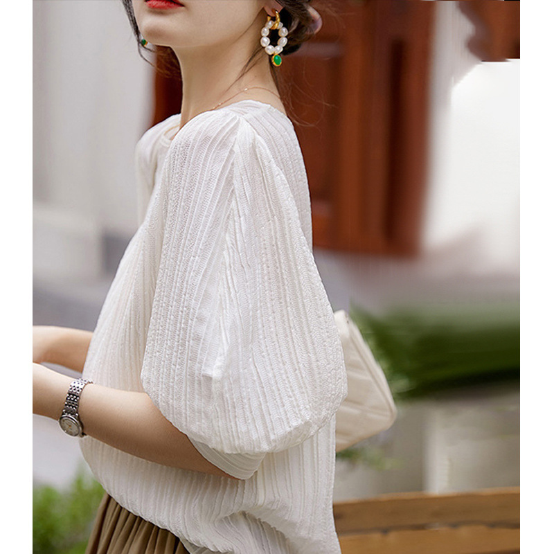 エレガントなボリューム袖が特徴的な白色ブラウスです。