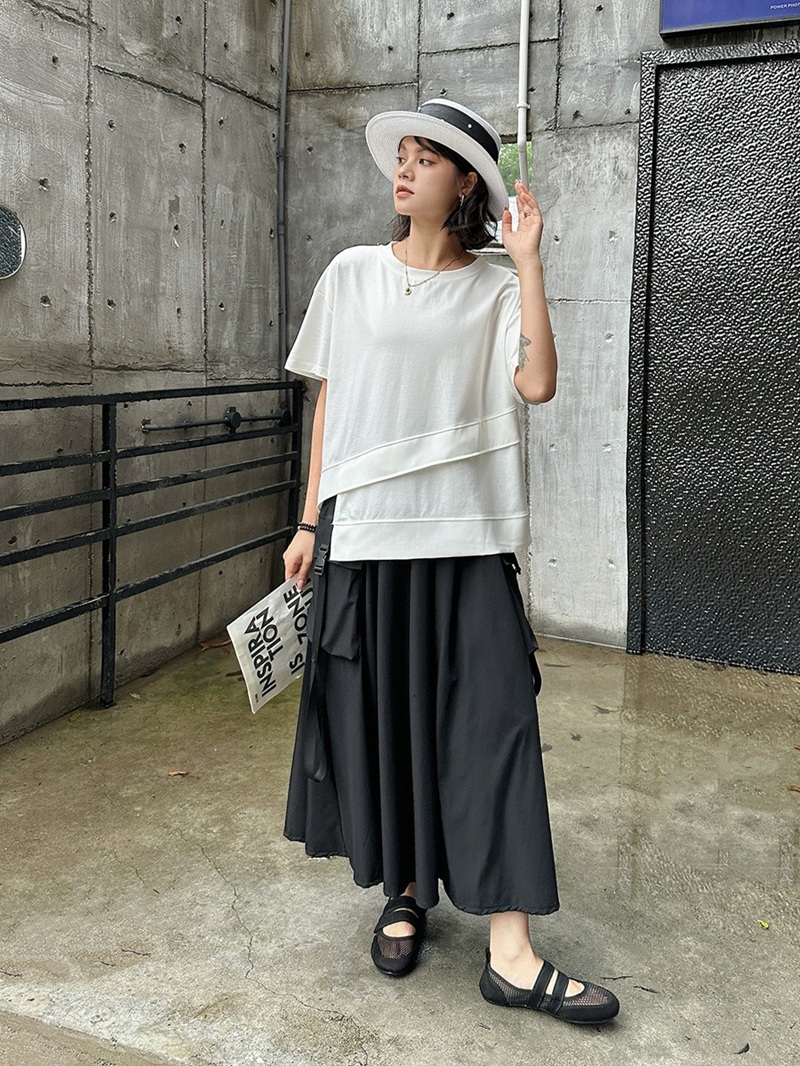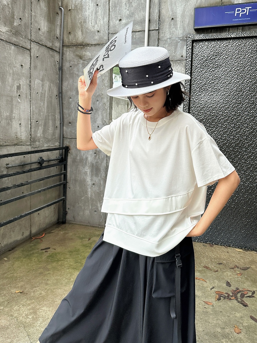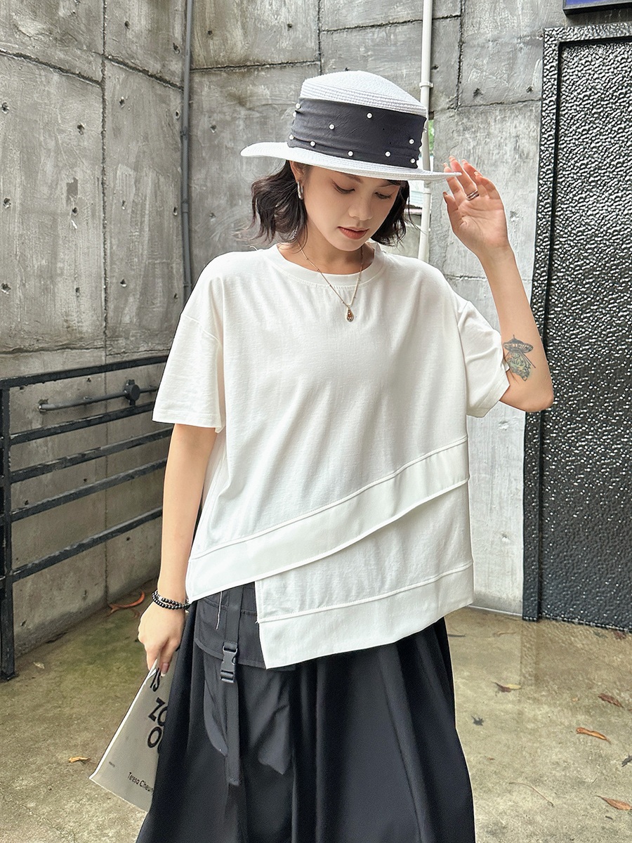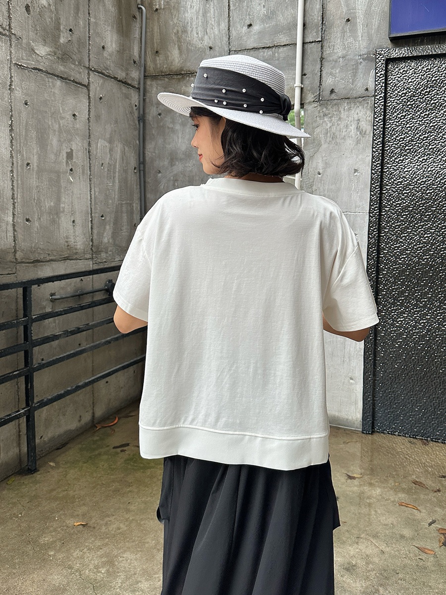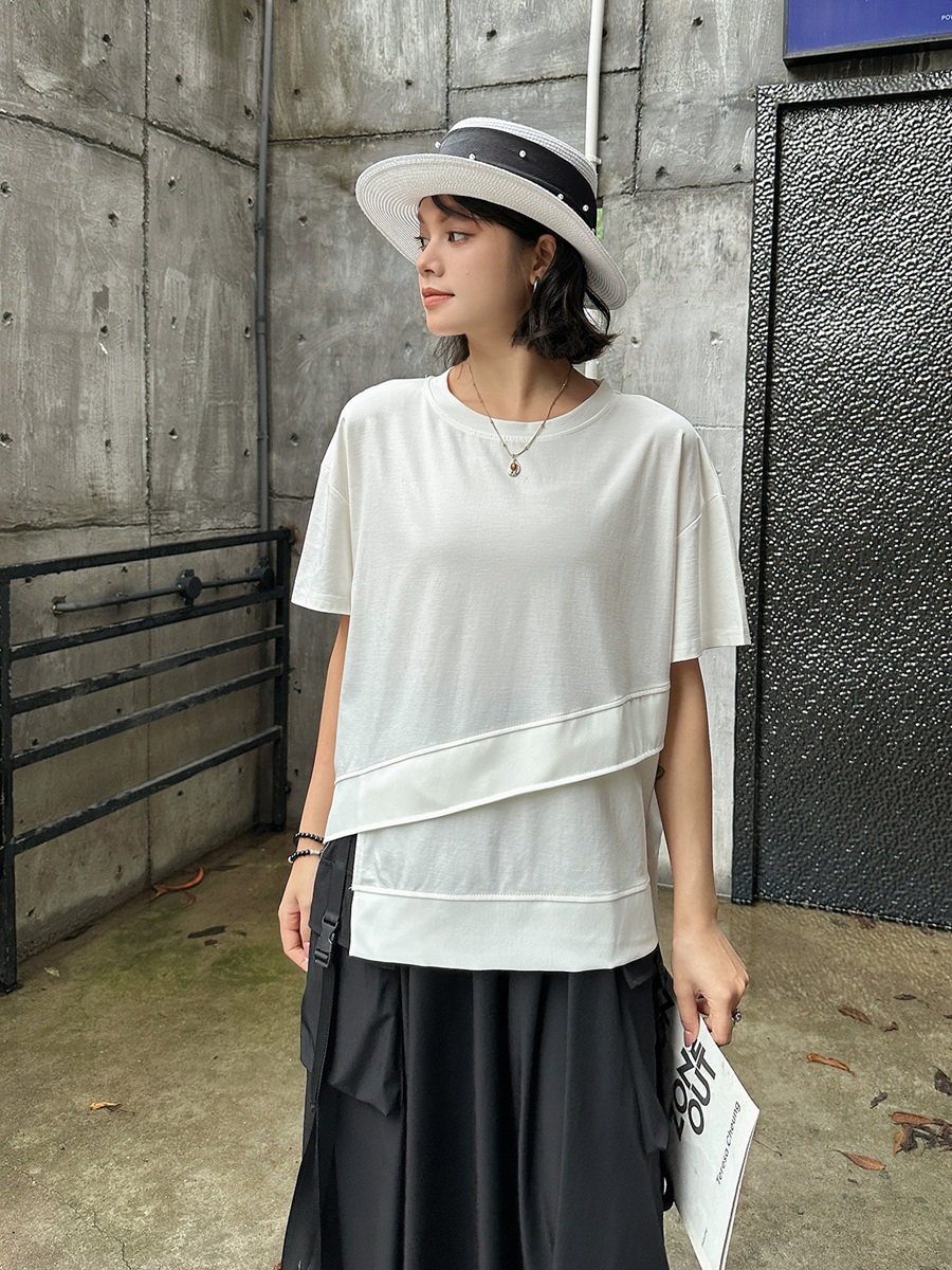 白コーデの主役になる個性的な切替デザインが魅力の夏用トップスです。