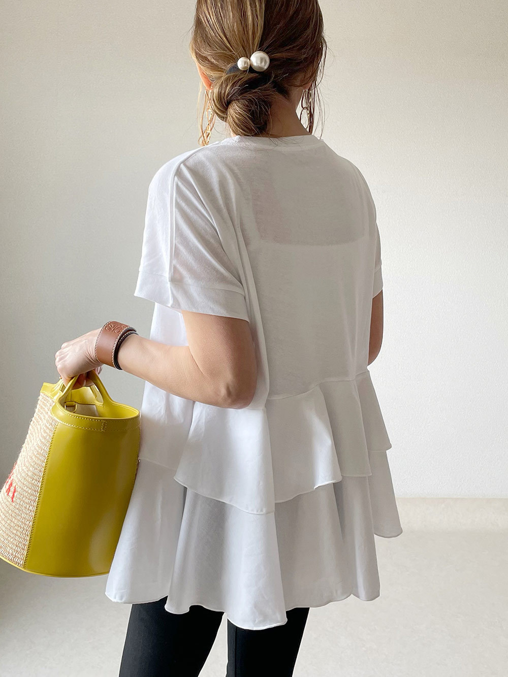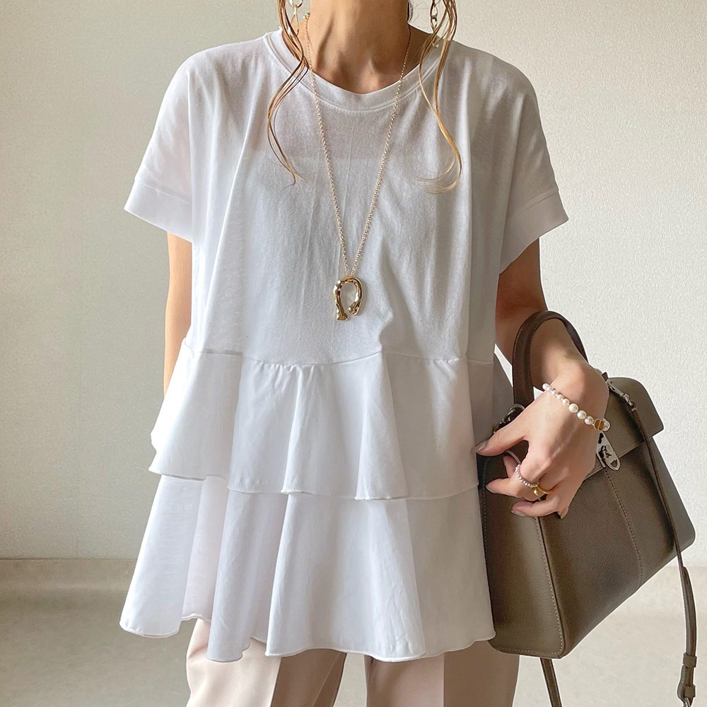 上品な白コーデを完成させる、ティアードフリルデザインの半袖トップス。