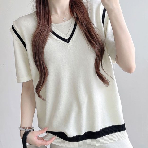 縁取りのラインデザインが特徴的な半袖トップスと、ゆったりとしたワイドパンツの組み合わせです。