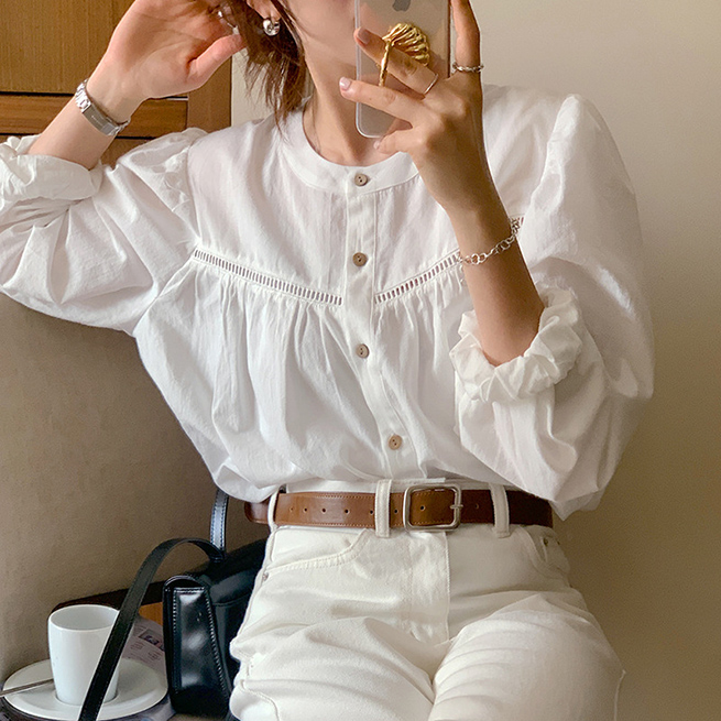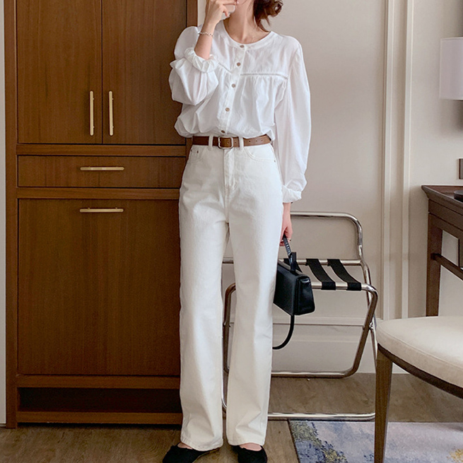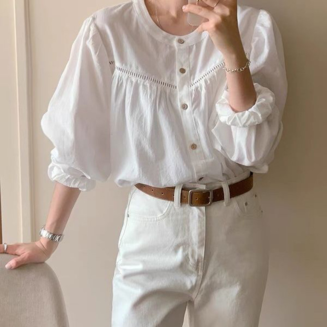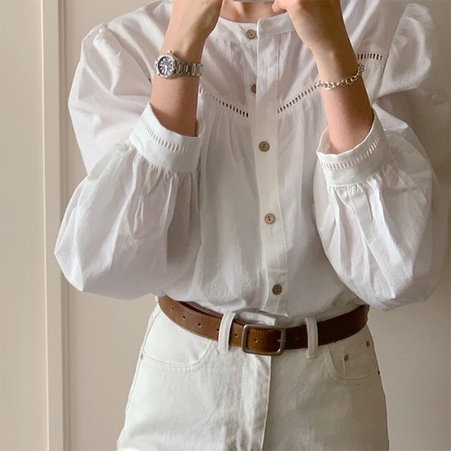 白コーデの定番アイテムとして活躍する上品な刺繍入りブラウス。
