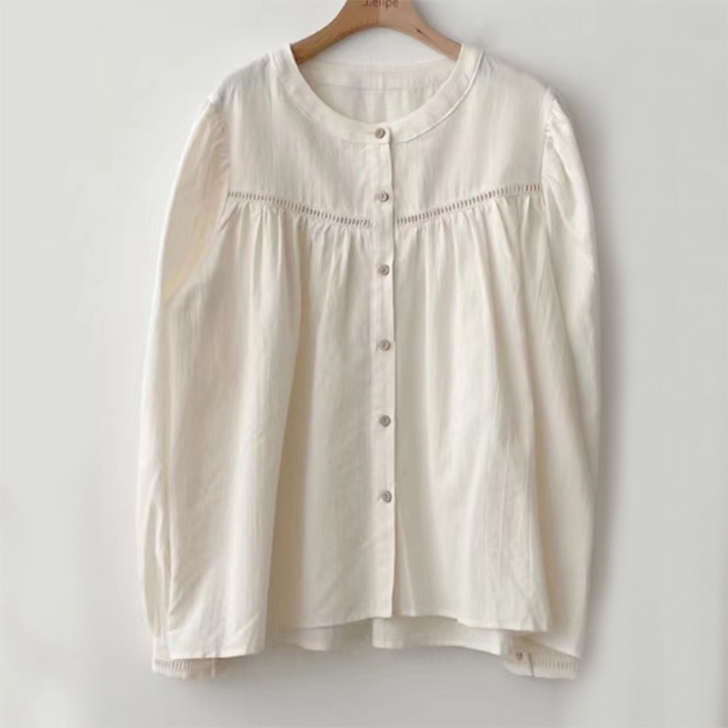 丸襟デザインと胸元の繊細な刺繍ディテールが女性らしさを演出します。
