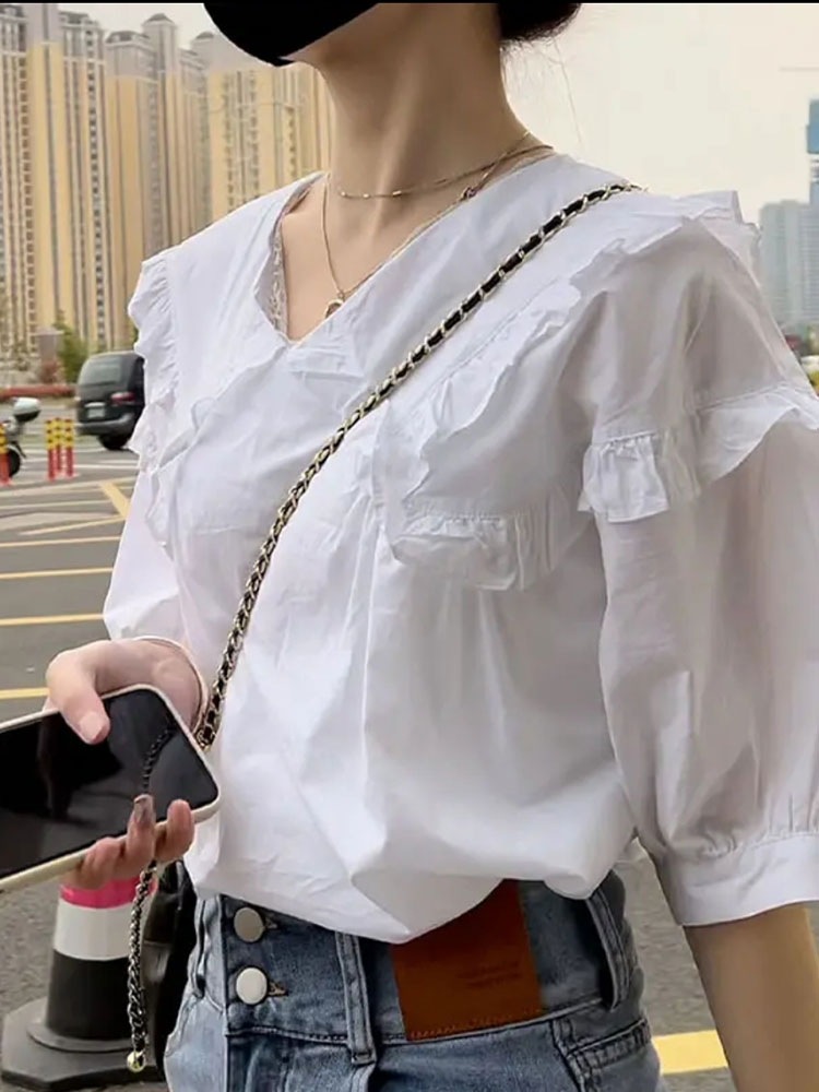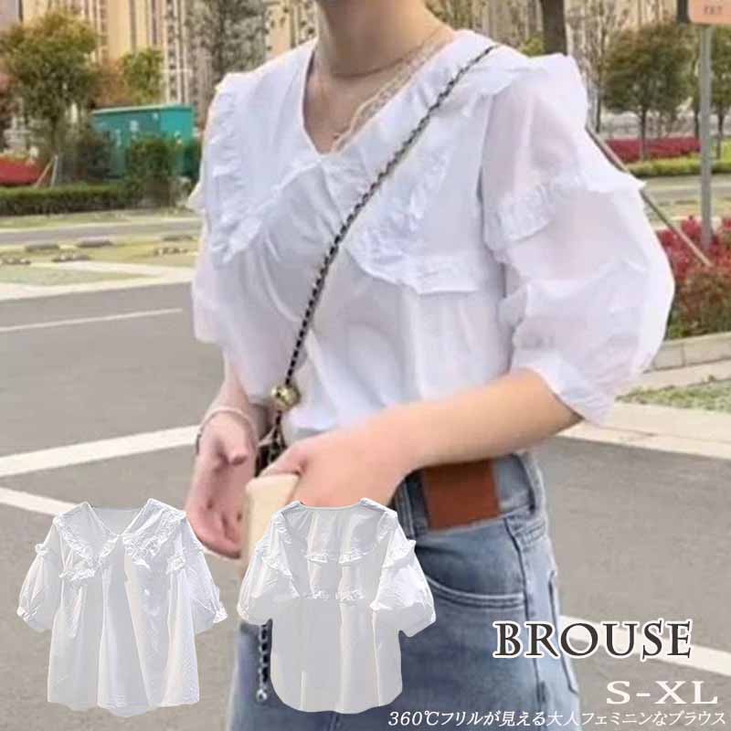 春夏にぴったりの可愛いフリル袖が特徴的な白ブラウスです。