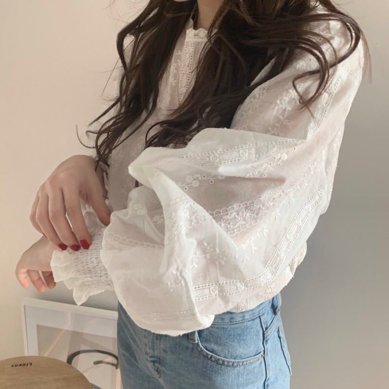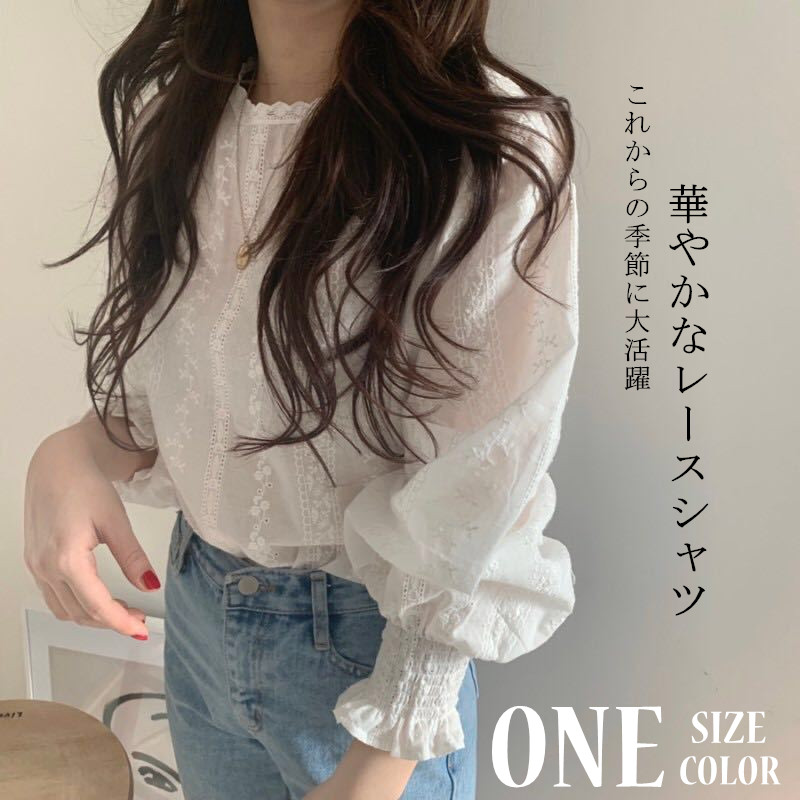 繊細な花柄レースが美しい長袖ブラウスです。