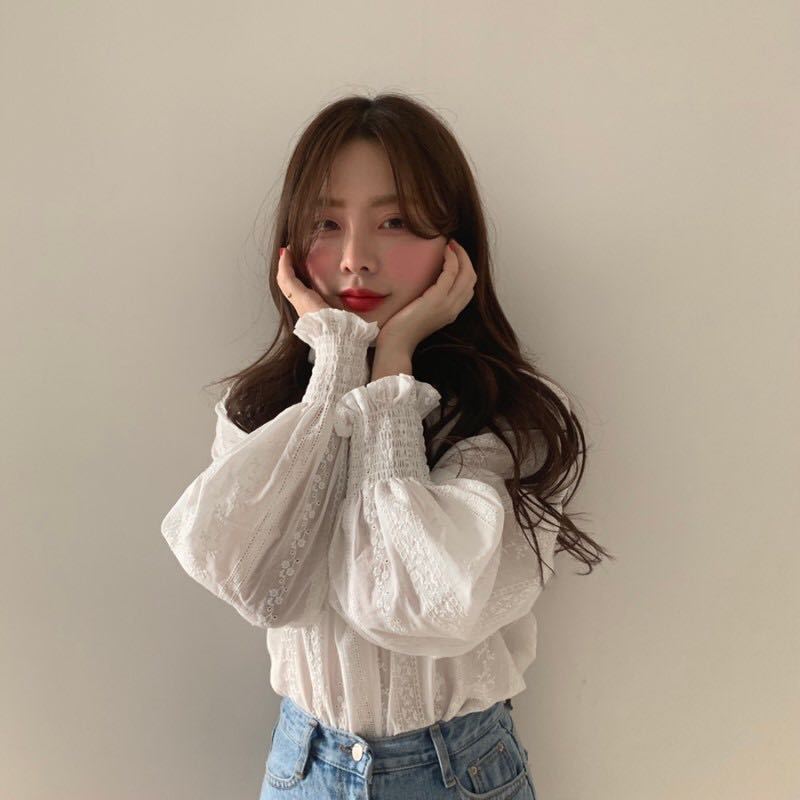 ふんわりとしたバルーン袖と上品な透け感で、女性らしい印象を演出します。