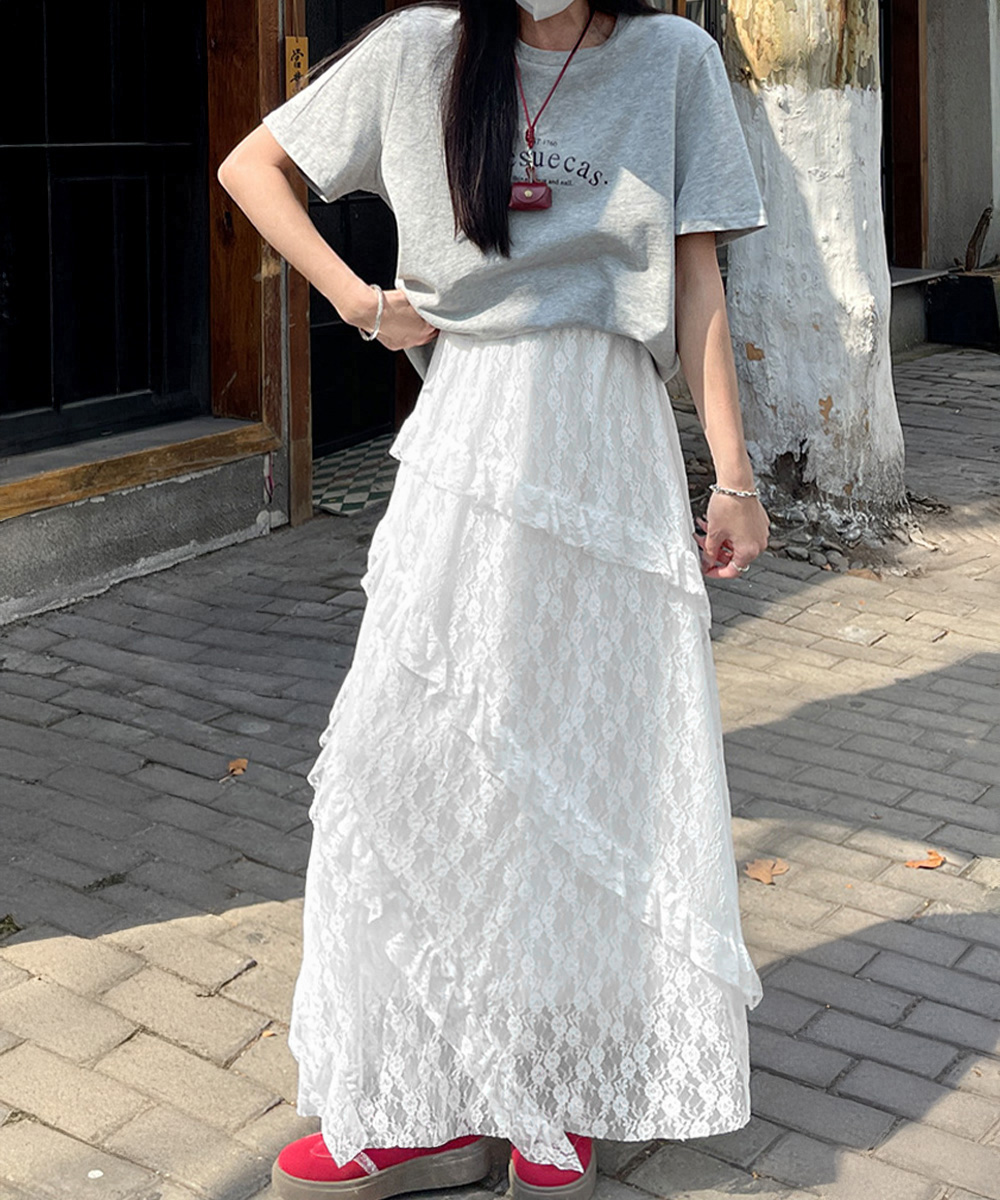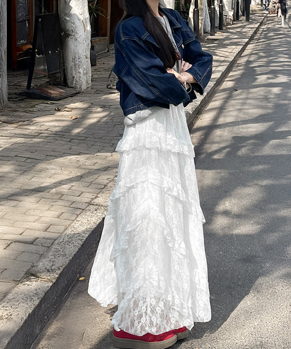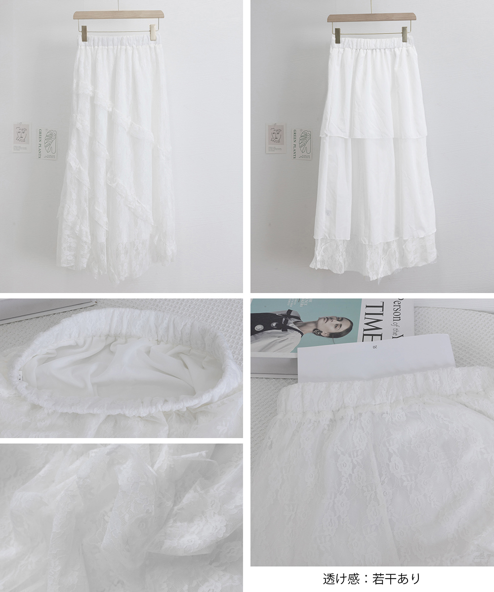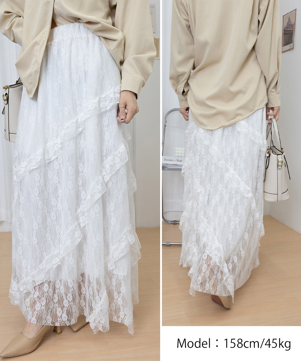 繊細な白レース素材を使用した、フェミニンで上品なティアードロングスカート。