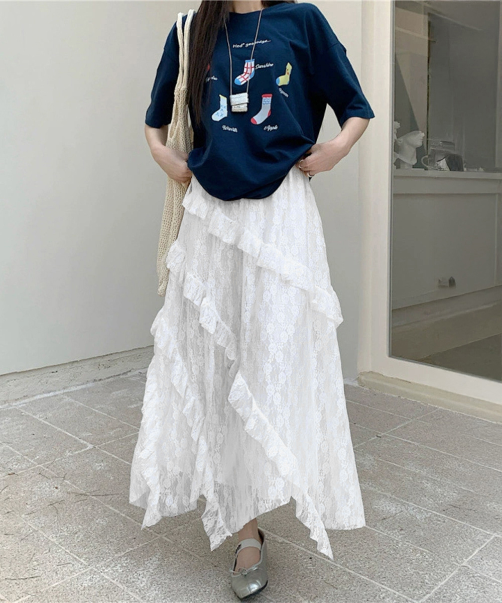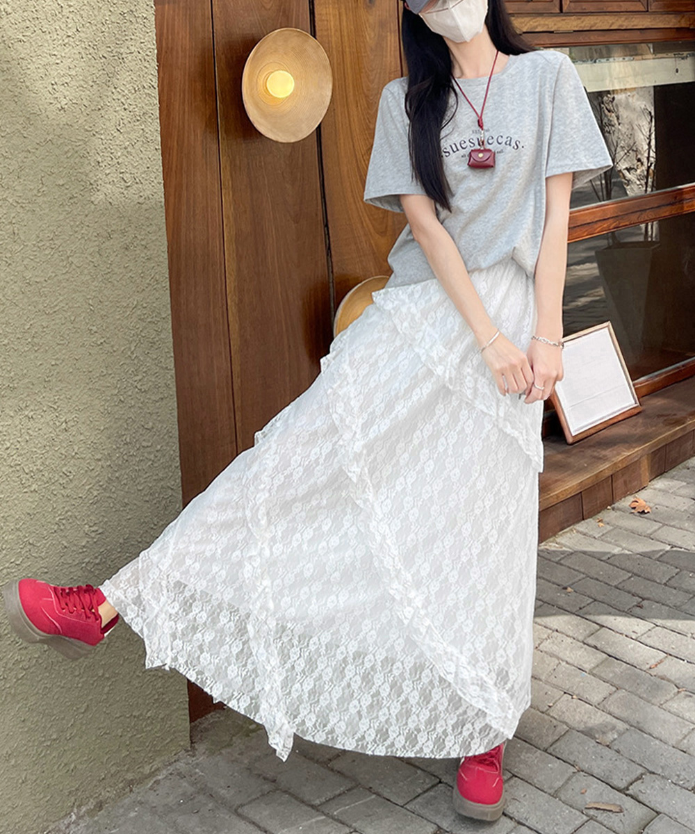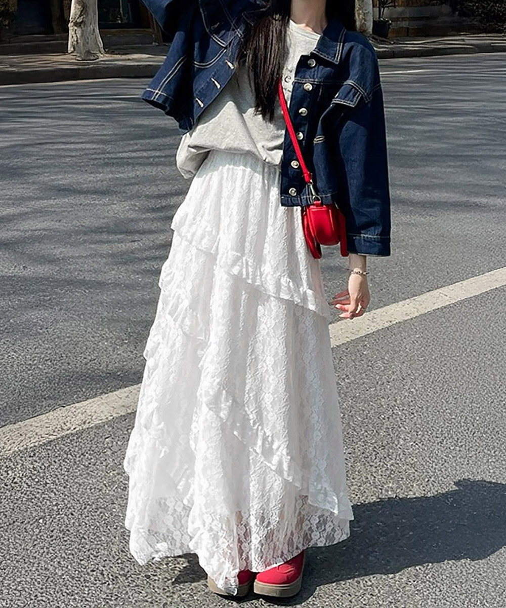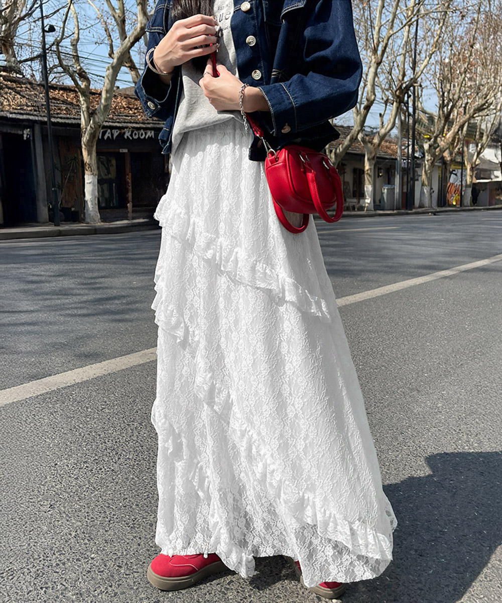 繊細な白レース素材を使用した、フェミニンで上品なティアードロングスカート。
